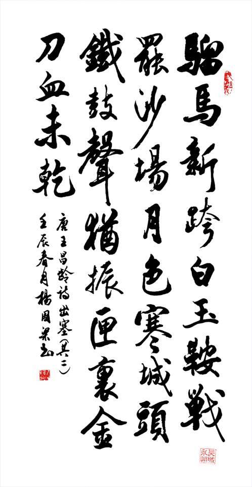 骝马新跨白玉鞍,战罢沙场月色寒。城头铁鼓声犹振,匣里金刀血未干。——唐·王昌龄《出塞二首·其二》